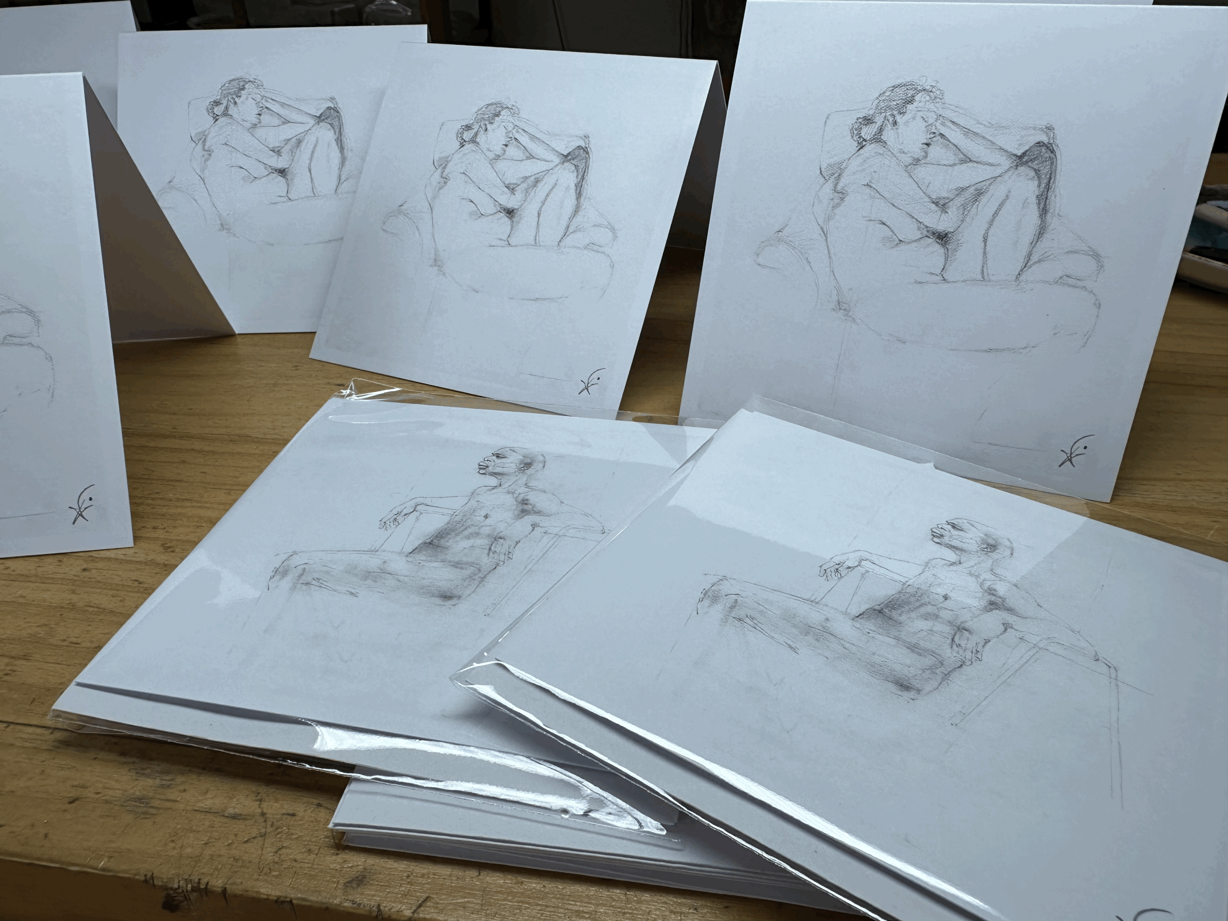 Life drawings "take a pause" and "rest" , "sistership", "message rings" and "Thistledown hands" printed onto Folded card with envelope
